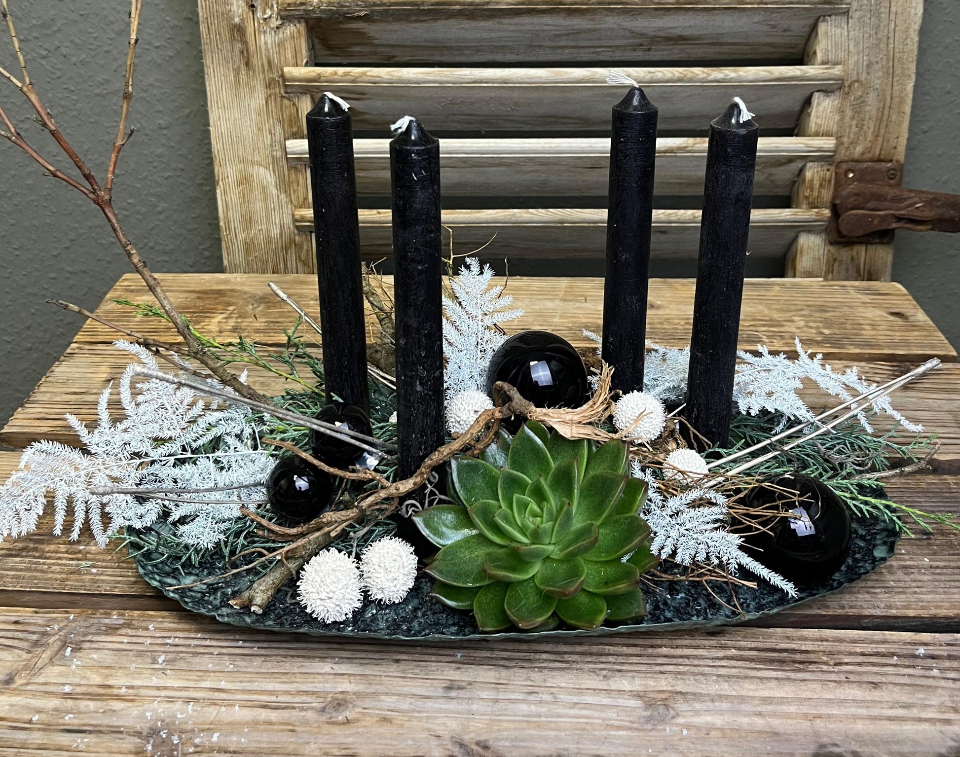 Elegantes Metalltablett mit vier magnetischen Kerzenhaltern – schlicht, praktisch und das ganze Jahr über vielseitig einsetzbar. Die Kerzenhalter lassen sich dank Magnetfunktion flexibel verschieben oder ganz abnehmen, sodass das Tablett immer wieder neu dekoriert werden kann.