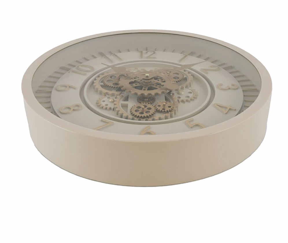 Diese cremefarbene Wanduhr mit goldenen großen Ziffern von hat ein rundes, rustikales Design mit Bronzezeigern und offenen, sich drehenden Zahnrädern.